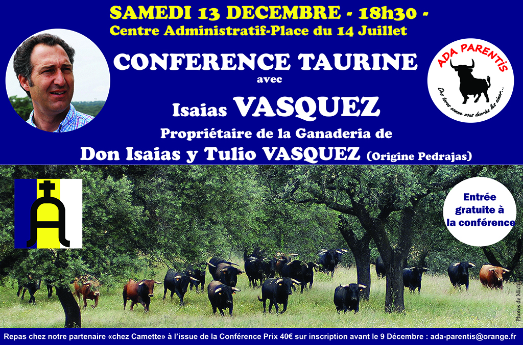 L’Association des Aficionados de Parentis (ADA) recevra ISAIAS VASQUEZ Propriétaire de la Ganaderia de Don Isaias y Tulio Vasquez le SAMEDI 13 DECEMBRE à partir de 18h30 au Centre Administratif Place du 14 Juillet à Parentis en Born. La conférence est gratuite et ouverte à tous ceux qui le souhaitent. Pour ceux qui le voudront un repas est prévu au Restaurant « Chez Camette » à Biscarrosse moyennant une participation de 40€ par personne. Les inscriptions au repas sont ouvertes jusqu’au 9 Décembre 2025 dernier délai à : ada-parentis@orange.fr
